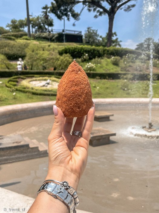 Proseguendo il tour abbiamo anche assaggiato uno dei piatti tipici più iconici della Sicilia: l’arancino al ragù e piselli nello storico Bar Savia, proprio di fronte a Villa Bellini.